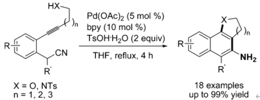 3. “Efficient Synthesis of Heterocyle-Fused β-Naphthylamines via Intramolecular Addition to a Cyano Group Initiated by Nucleopalladation of Alkynes.”