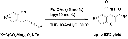 1. “Palladium(II)-Catalyzed Tandem Cyclization of 2-(Alk-2’-ynyloxy)benzonitriles or 2-(Alk-2’-ynylamino)- benzonitriles: A Facile Way to 2H-Chromene and 1,2-Dihydroquinoline Derivatives.”