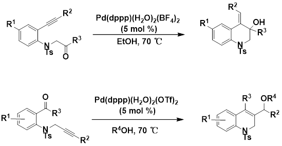 4. “Cationic Pd (II)-Catalyzed Cyclization of N-Tosyl-aniline Tethered Alkynyl Ketones Initiated by Hydropalladation of Alkynes: A Facile Way to 1, 2-Dihydro or 1, 2, 3, 4-Tetrahydroquinoline Derivatives.”
